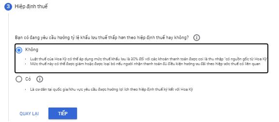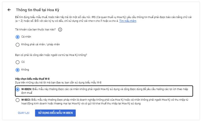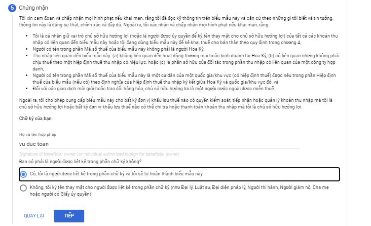 Các bạn để ý là 30% là áp dụng với lượt xem tính tại đất Mỹ, còn kênh của các bạn mà lượt xem là người việt và các nước khác thì sẽ không phải tính thuế, chỉ khi nào người mỹ xem thì mới tính thuế mà thôi. Ngược lại các bạn không khai báo thì các bạn sẽ bị truy thu 24% áp dụng trên tất cả các lượt xem trên toàn thế giới. Ngoan ngoãn khai báo, nếu video của bạn mà lượt xem người mỹ ít thì cũng chả thiệt thòi gì !