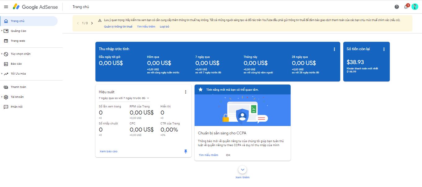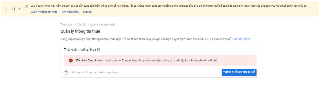 Gần đây mình cũng như các bạn khi lên youtube nhận được 1 thông báo đỏ khè, nội dung đại ý như sau , chủ kênh youtube cần khai báo thuế trước 31/5 nếu không youtube sẽ áp mức thuế cao nhất là 24% đối với toàn bộ lượt xem trên phạm vi toàn thế giới.
