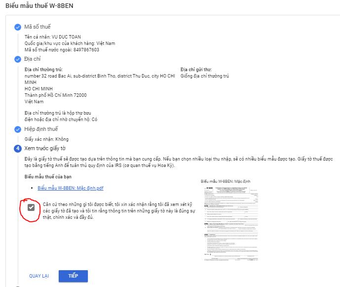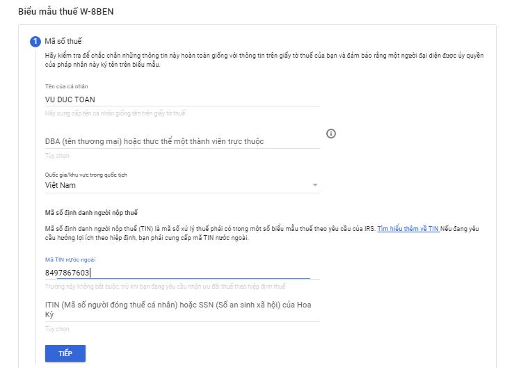 Trong hình này các bạn nhập tên của mình không có dấu nhé, và quan trọng là có cái mã TIN nước ngoài . Đây chính là mã số thuế của bạn đấy . cái này ai lỡ quên thì tra vào trang web này nhé : masothue.com