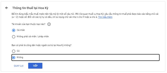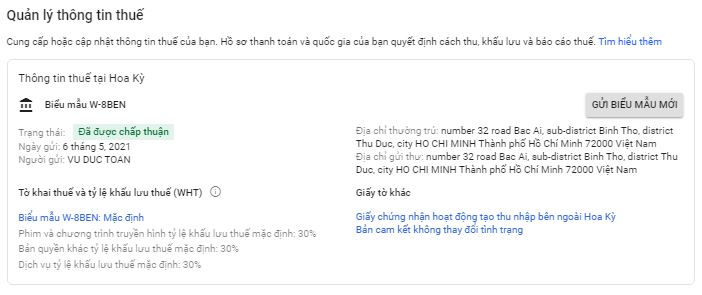 Các bạn để ý là 30% là áp dụng với lượt xem tính tại đất Mỹ, còn kênh của các bạn mà lượt xem là người việt và các nước khác thì sẽ không phải tính thuế, chỉ khi nào người mỹ xem thì mới tính thuế mà thôi. Ngược lại các bạn không khai báo thì các bạn sẽ bị truy thu 24% áp dụng trên tất cả các lượt xem trên toàn thế giới. Ngoan ngoãn khai báo, nếu video của bạn mà lượt xem người mỹ ít thì cũng chả thiệt thòi gì !