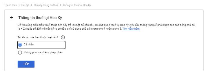 Chọn mục "cá nhân" sau đó nhấn nút "Tiếp"