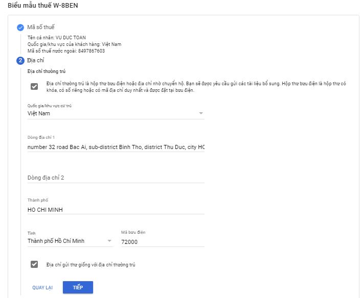 Khai báo địa chỉ của bạn, bằng tiếng anh nhé, ví dụ mình khai báo: "số 32 đường Bác Ái, phường Bình Thọ, quận Thủ Đức, thành phố Hồ Chí Minh" các bạn sẽ khai như sau : "number 32 road Bac Ai, sub- district Binh Tho, district Thu Duc, city Ho Chi Minh "